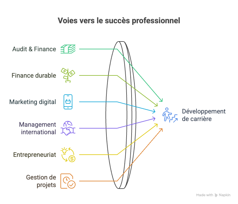 Cycle Master (2 ans) : approfondissement et spécialisation dans des domaines comme la finance, le marketing digital, le management international, la RSE ou l’entrepreneuriat, avec un stage de fin d’études et un mémoire professionnel.